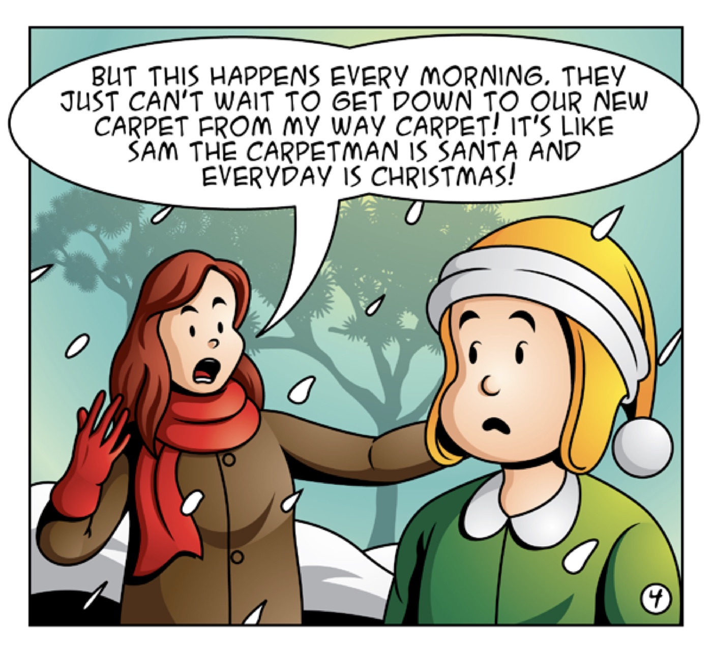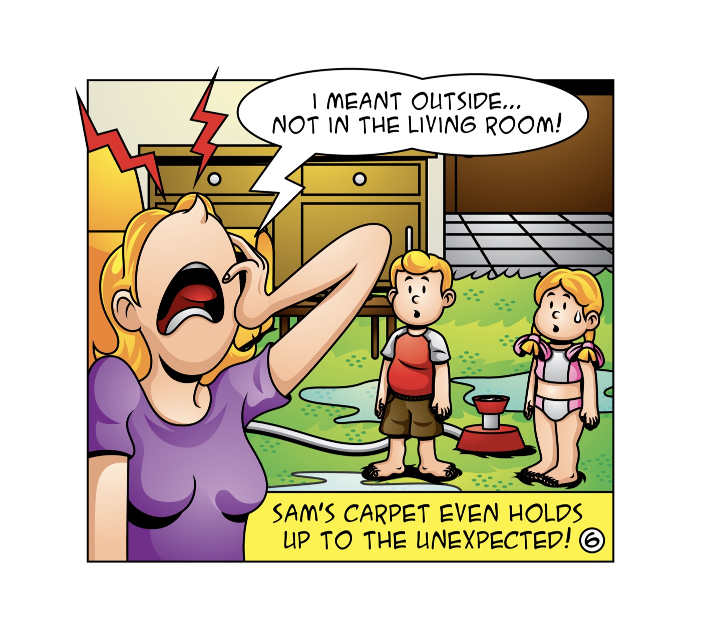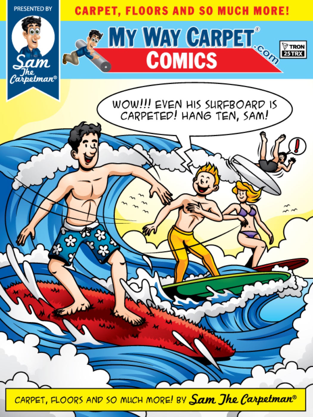 Most carpet stores advertise with boring coupons in your mailbox. My Way Carpet makes comic books. Every issue stars Sam the Carpet Man and his real-world mobile-carpet-store adventures — only weirder, funnier, and hand-drawn by two of the most talented illustrators alive. An ex-Archie artist roughs out the panels; a Disney colorist brings them to life. And then they land in your hands.