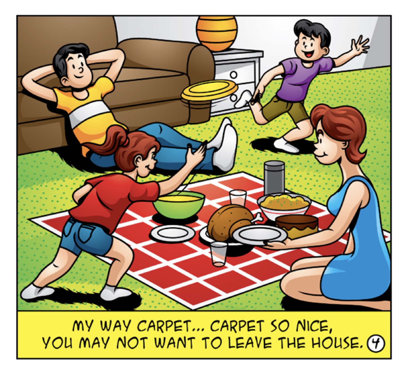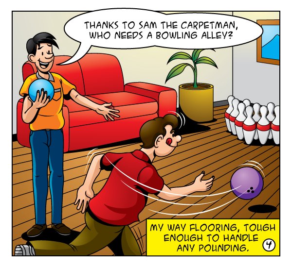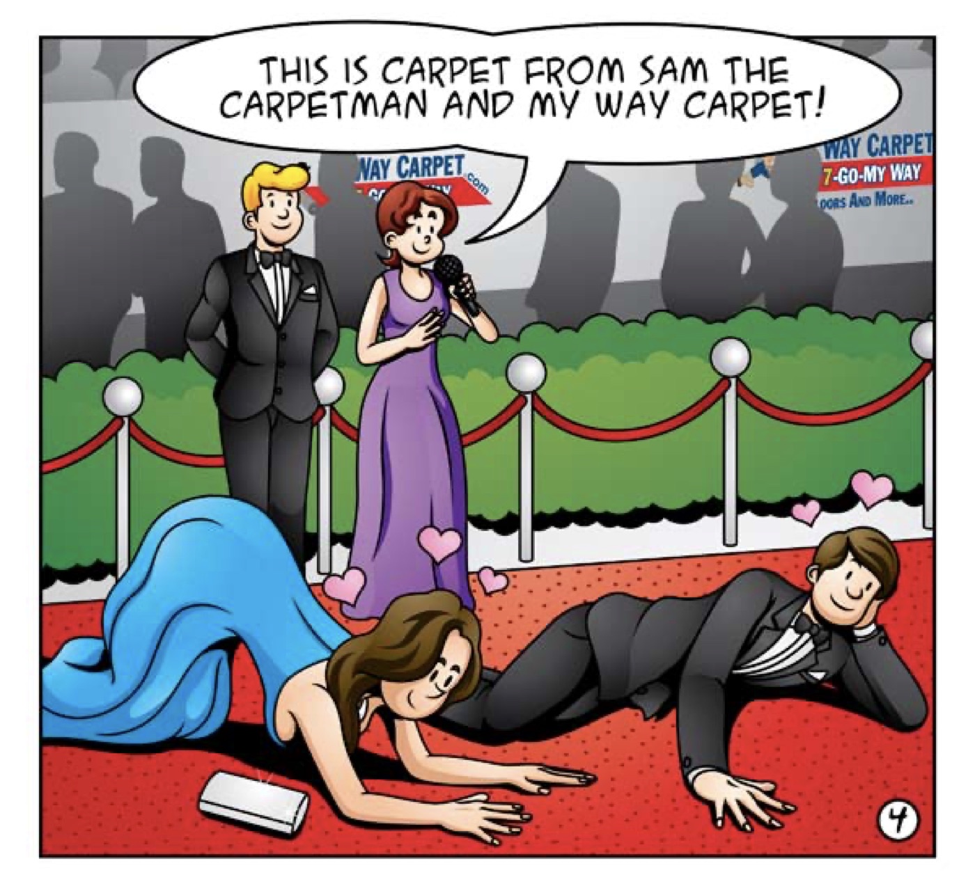 Most carpet stores advertise with boring coupons in your mailbox. My Way Carpet makes comic books. Every issue stars Sam the Carpet Man and his real-world mobile-carpet-store adventures — only weirder, funnier, and hand-drawn by two of the most talented illustrators alive. An ex-Archie artist roughs out the panels; a Disney colorist brings them to life. And then they land in your hands.