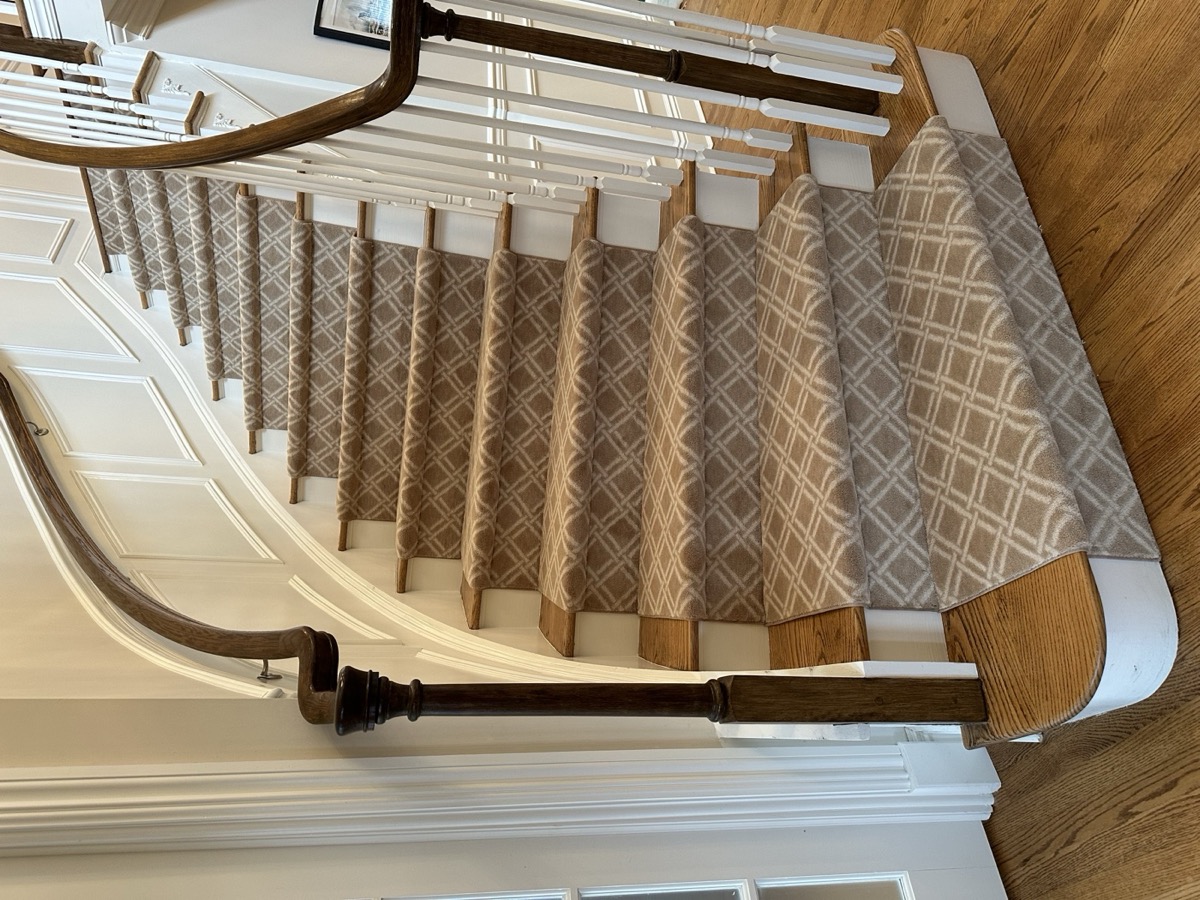 Timeless runner choices with color-matched binding, installed on straight runs, L-shapes, and curved-with-winder staircases across New Jersey.