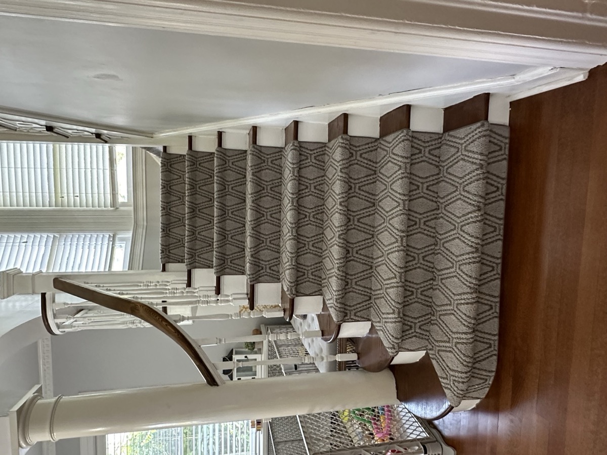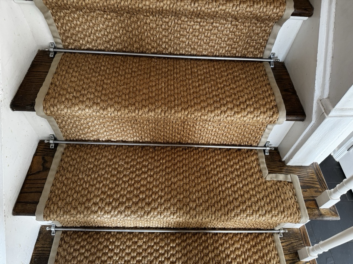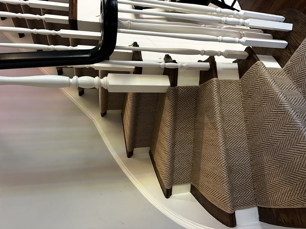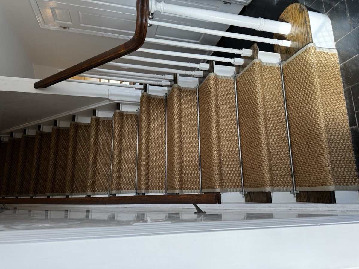Every stair runner we install is a custom job. We measure on-site, bind the exact length needed in your choice of 30+ binding colors, and install with the precision the staircase deserves. Herringbone-with-black-binding is our signature look — but we do sisal, plaid, patterned, solid, period-traditional, and everything in between. Waterfall or Hollywood install methods. Stair rods optional. One staircase or an entire home, same team, same standard.