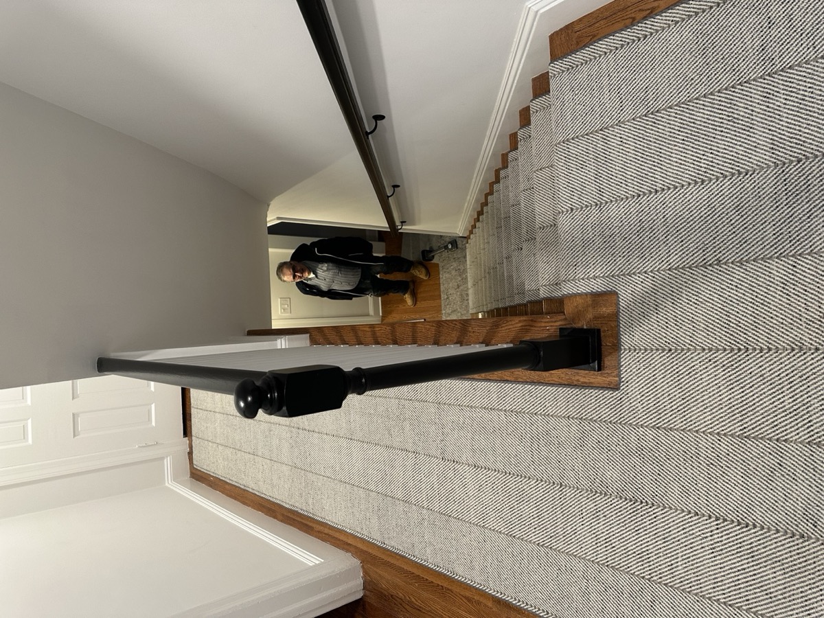 A well-installed stair runner turns a plain staircase into a design moment. Herringbone with black wide binding. Sisal with chrome stair rods. Grand curves, waterfall installs, bespoke color binding in 30+ shades. Family owned since 1998. Free in-home consult & on-the-spot pricing.