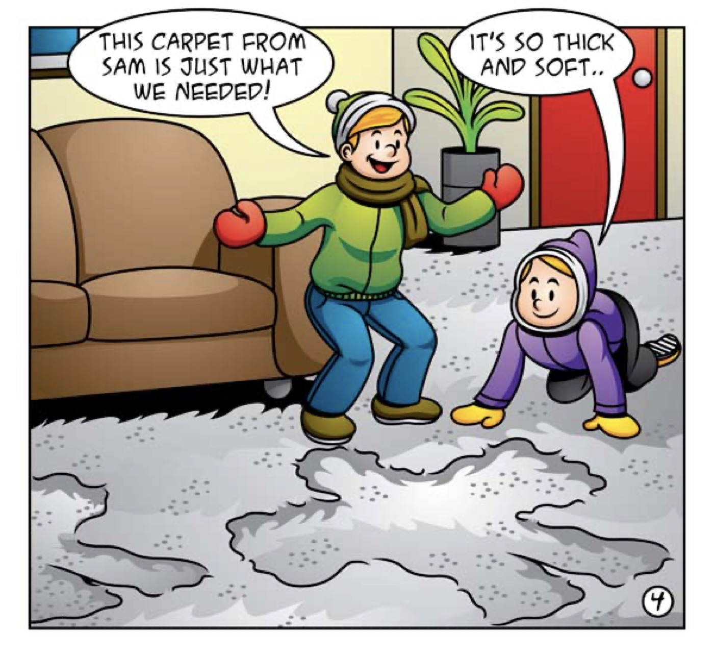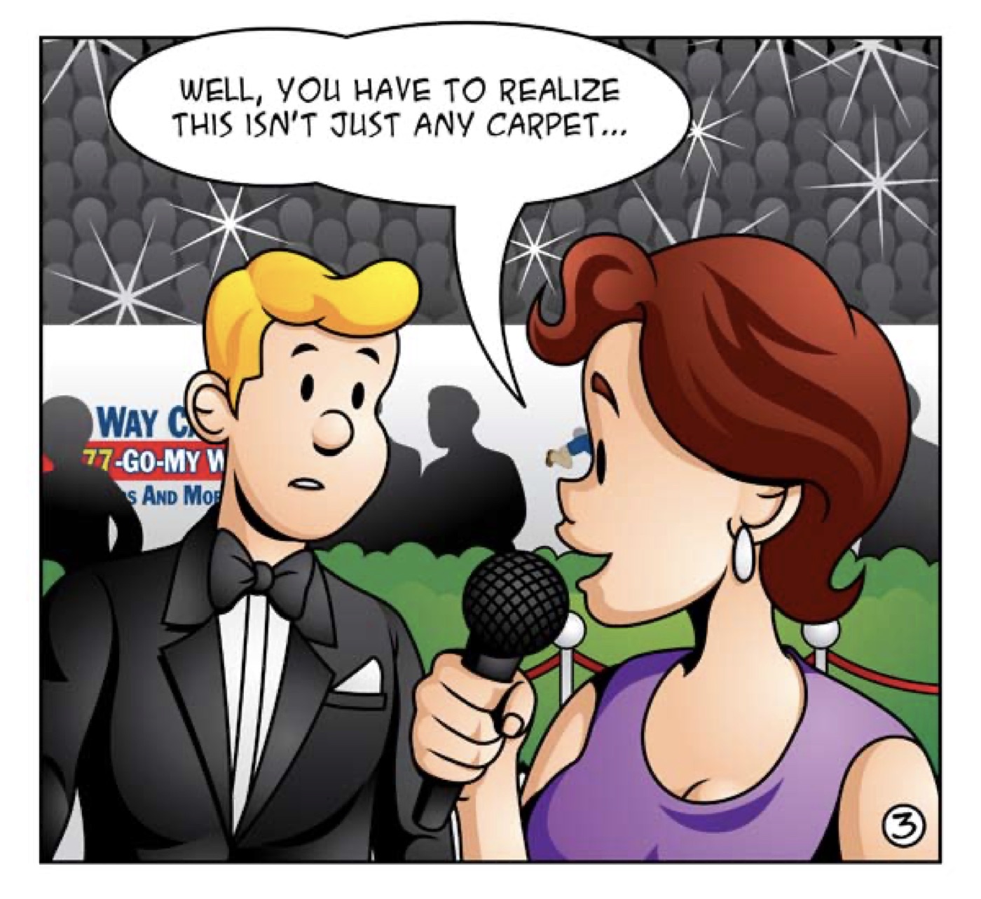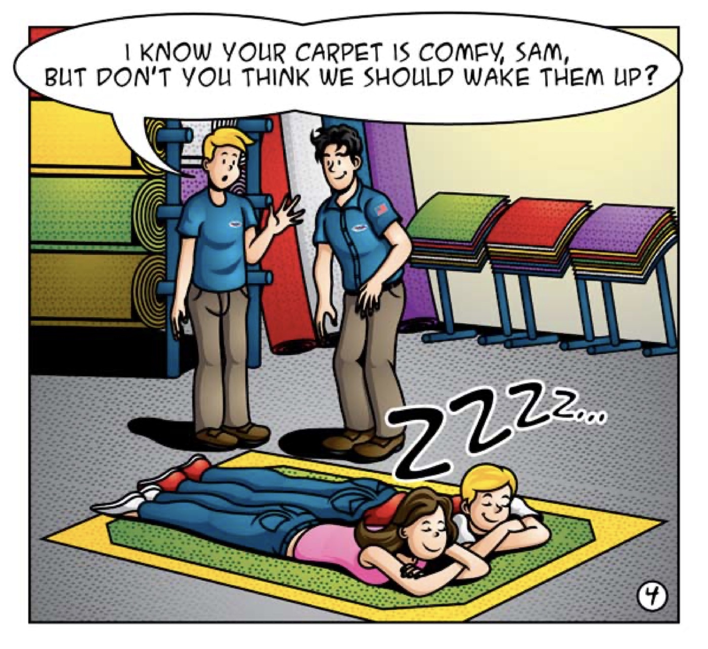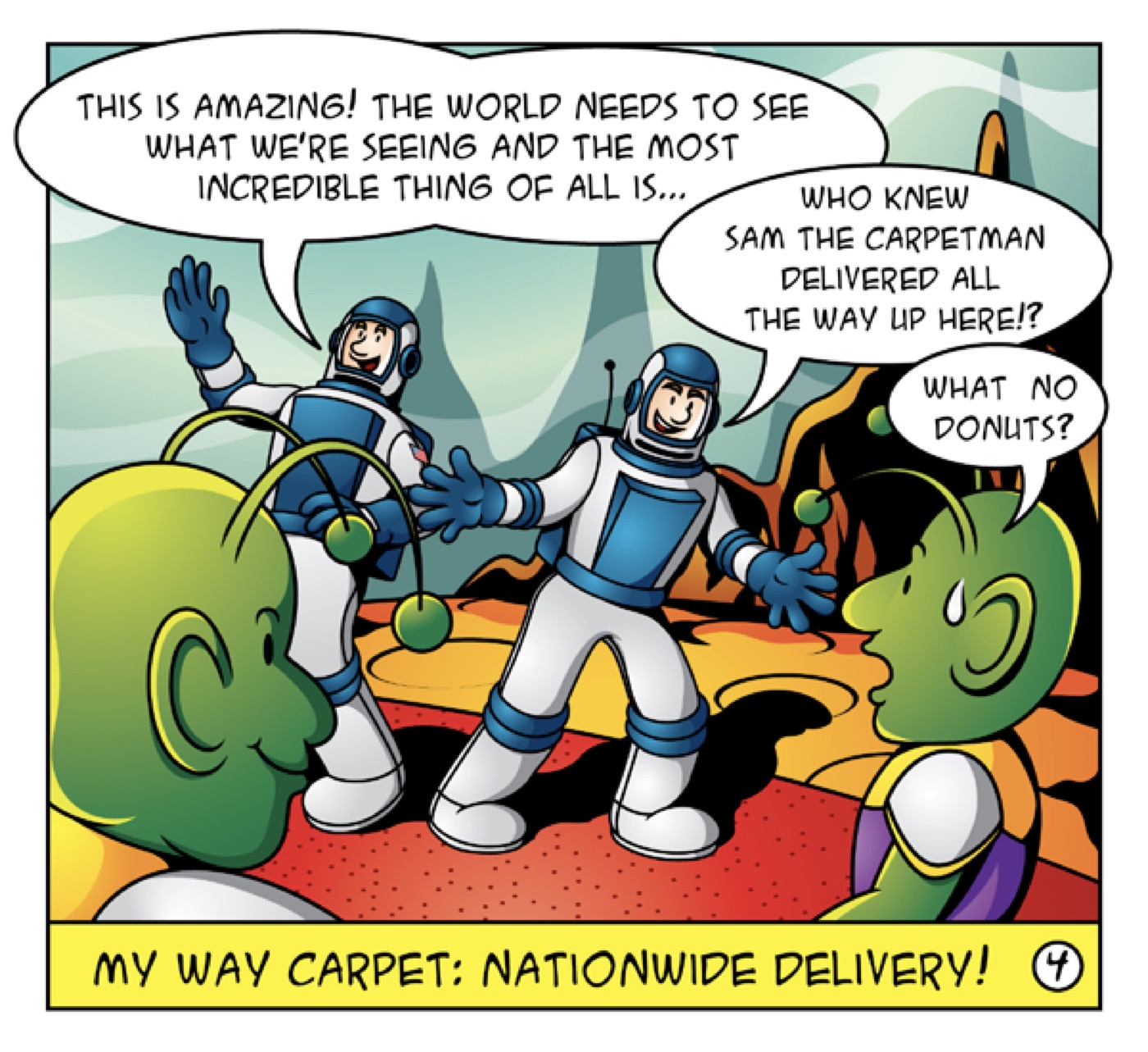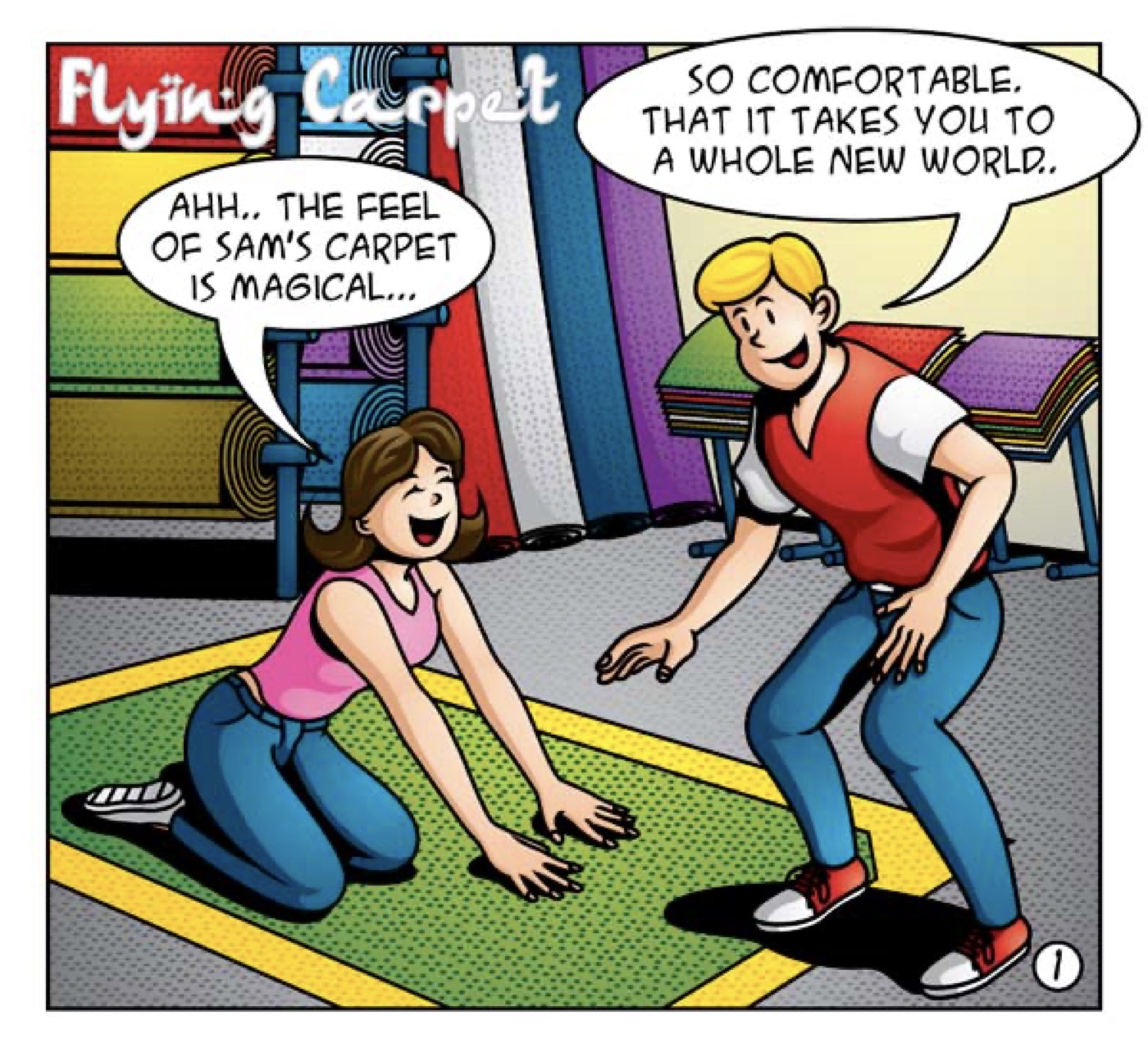 Most carpet stores advertise with boring coupons in your mailbox. My Way Carpet makes comic books. Every issue stars Sam the Carpet Man and his real-world mobile-carpet-store adventures — only weirder, funnier, and hand-drawn by two of the most talented illustrators alive. An ex-Archie artist roughs out the panels; a Disney colorist brings them to life. And then they land in your hands.
