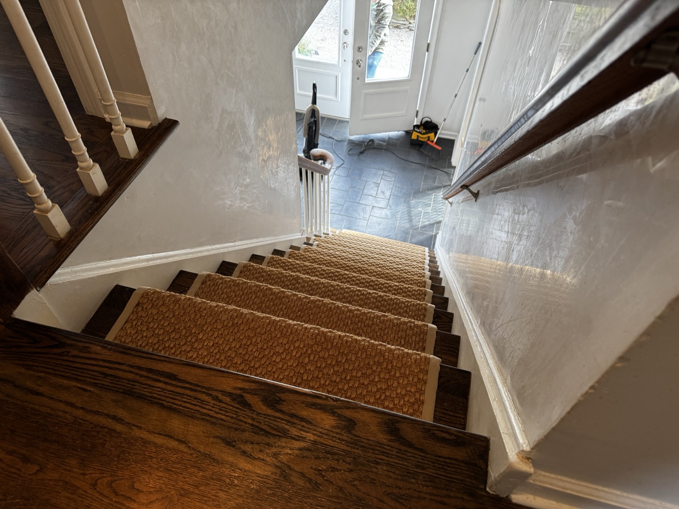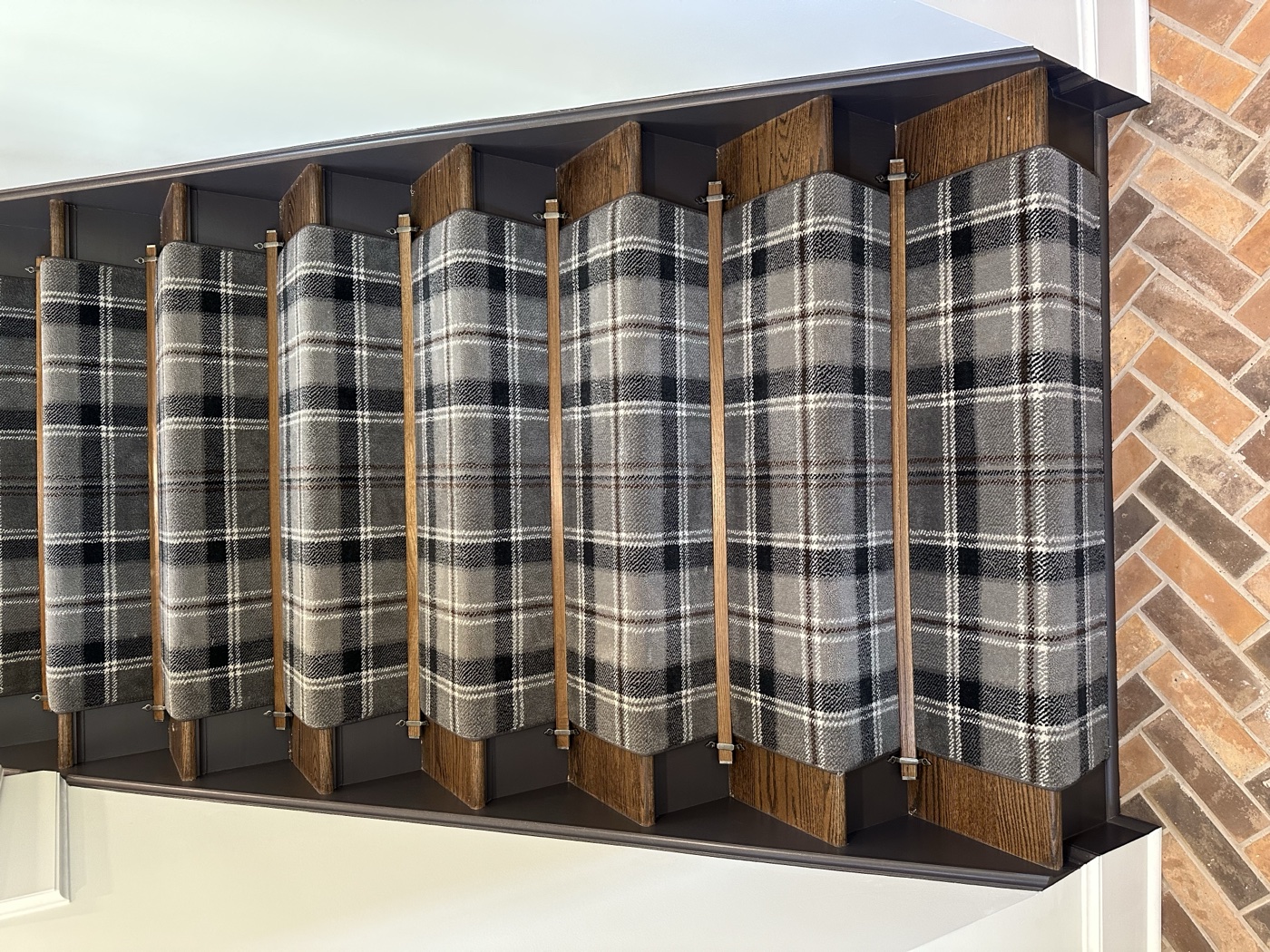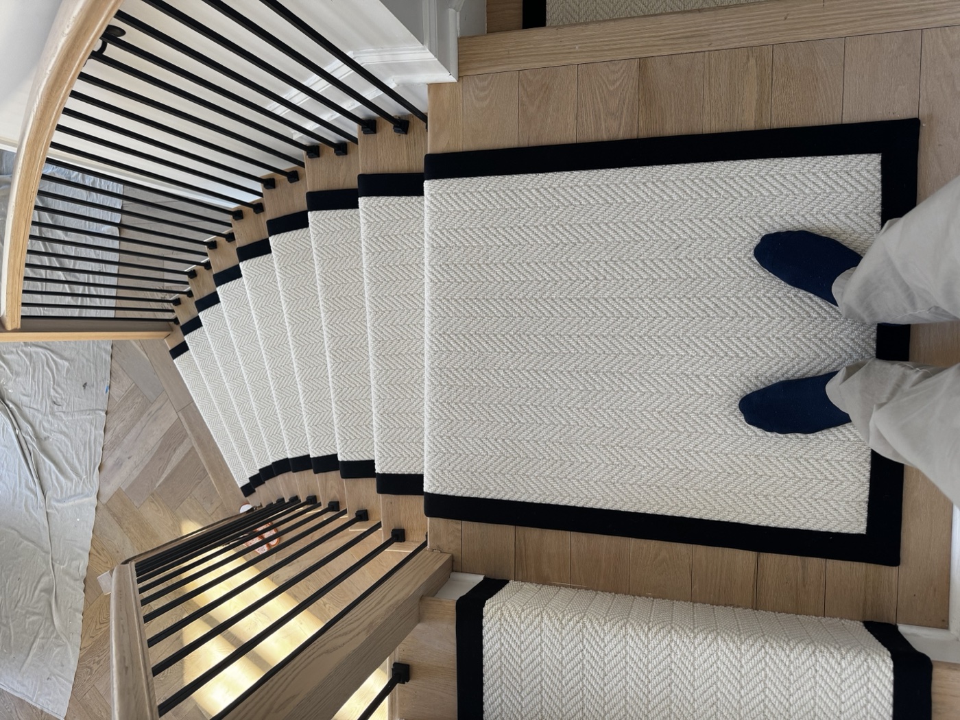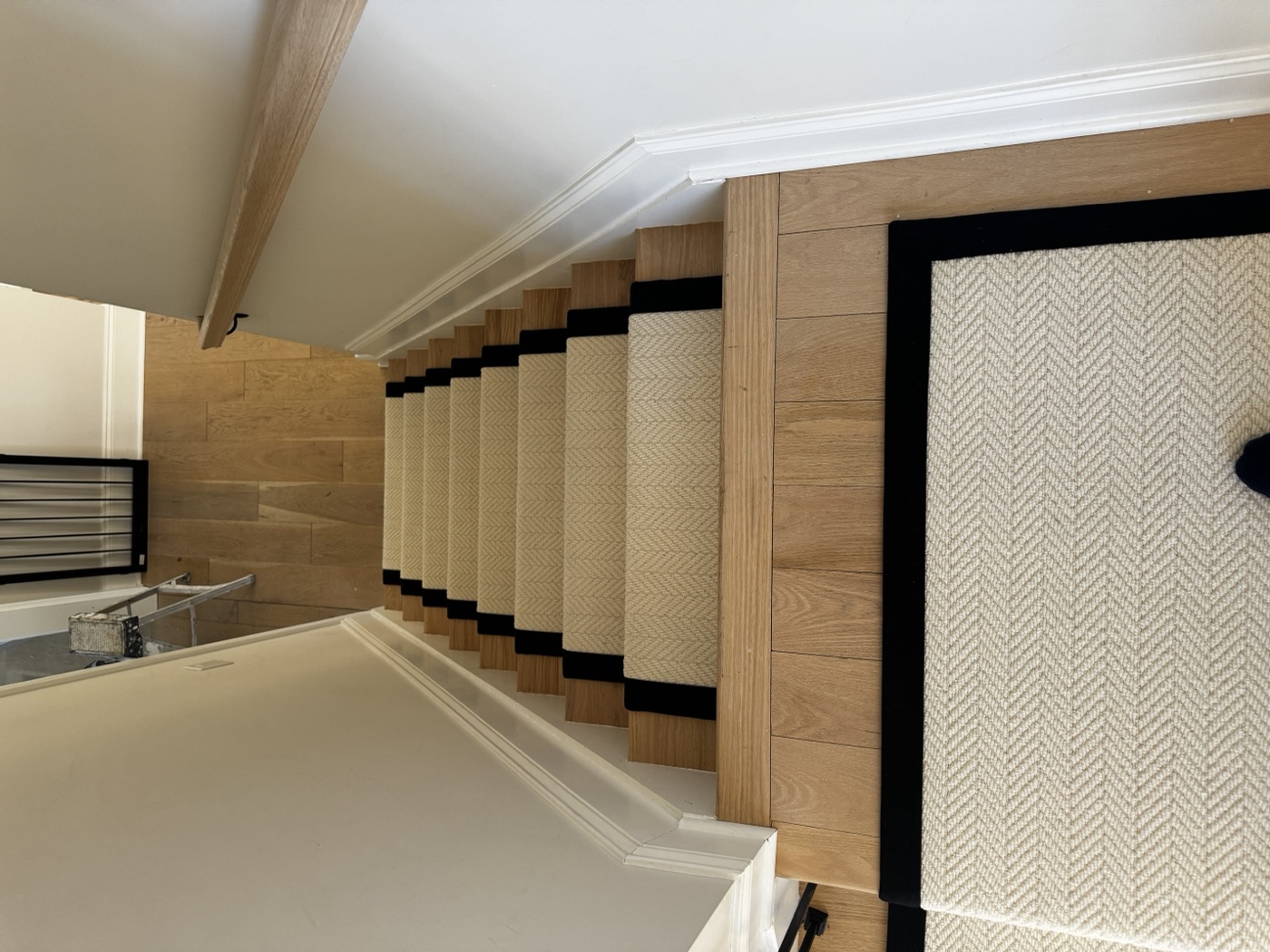 Every stair runner we install is a custom job. We measure on-site, bind the exact length needed in your choice of 30+ binding colors, and install with the precision the staircase deserves. Herringbone-with-black-binding is our signature look — but we do sisal, plaid, patterned, solid, period-traditional, and everything in between. Waterfall or Hollywood install methods. Stair rods optional. One staircase or an entire home, same team, same standard.