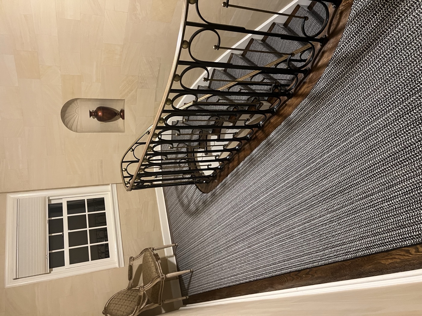 A well-installed stair runner turns a plain staircase into a design moment. Herringbone with black wide binding. Sisal with chrome stair rods. Grand curves, waterfall installs, bespoke color binding in 30+ shades. Family owned since 1998. Free in-home consult & on-the-spot pricing.